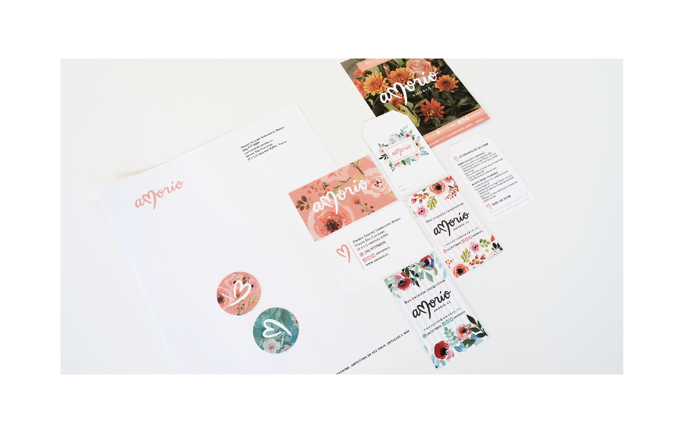 Diseño de imagen para florería, se trabajo bajo el concepto del nombre "amorío" y el amor.