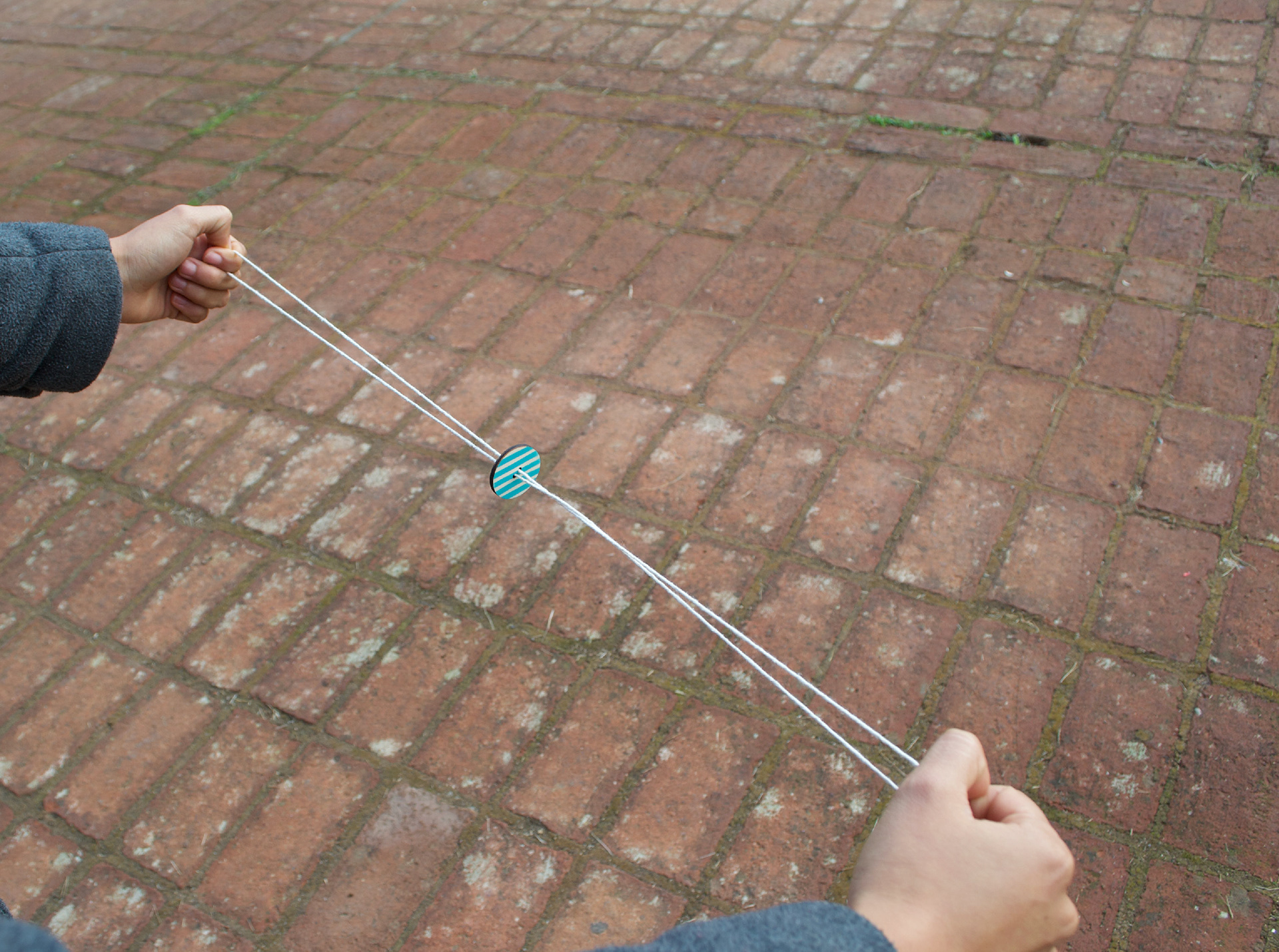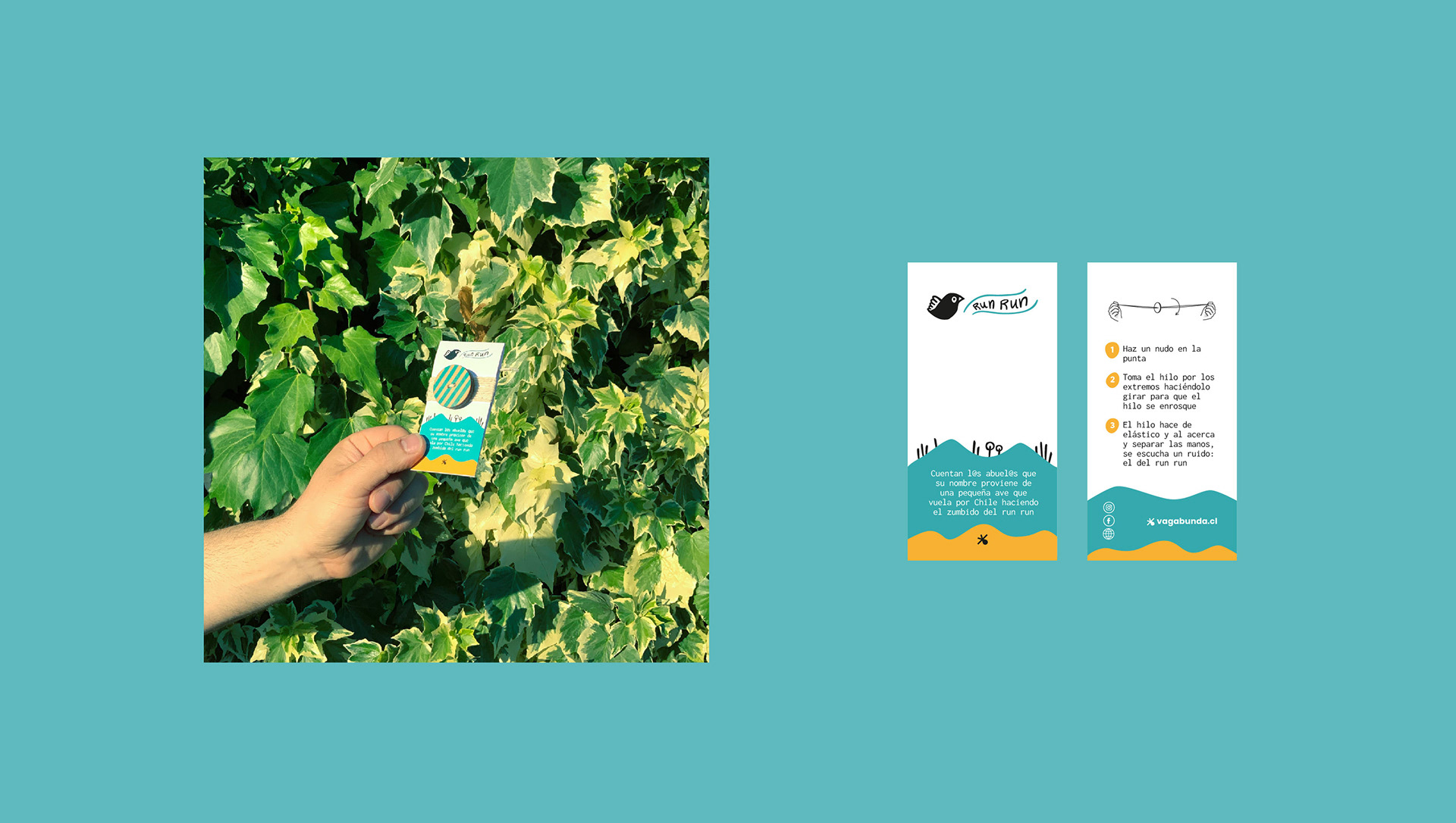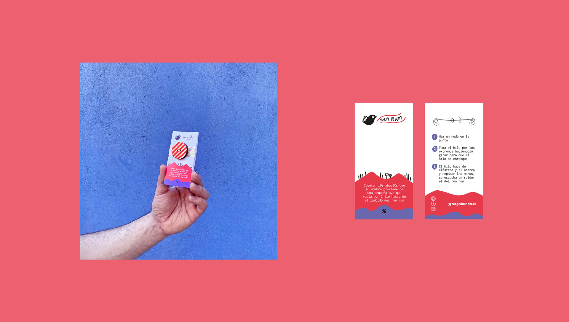 Rescate del juego tradicional Runrun con botón de madera pintado a mano.