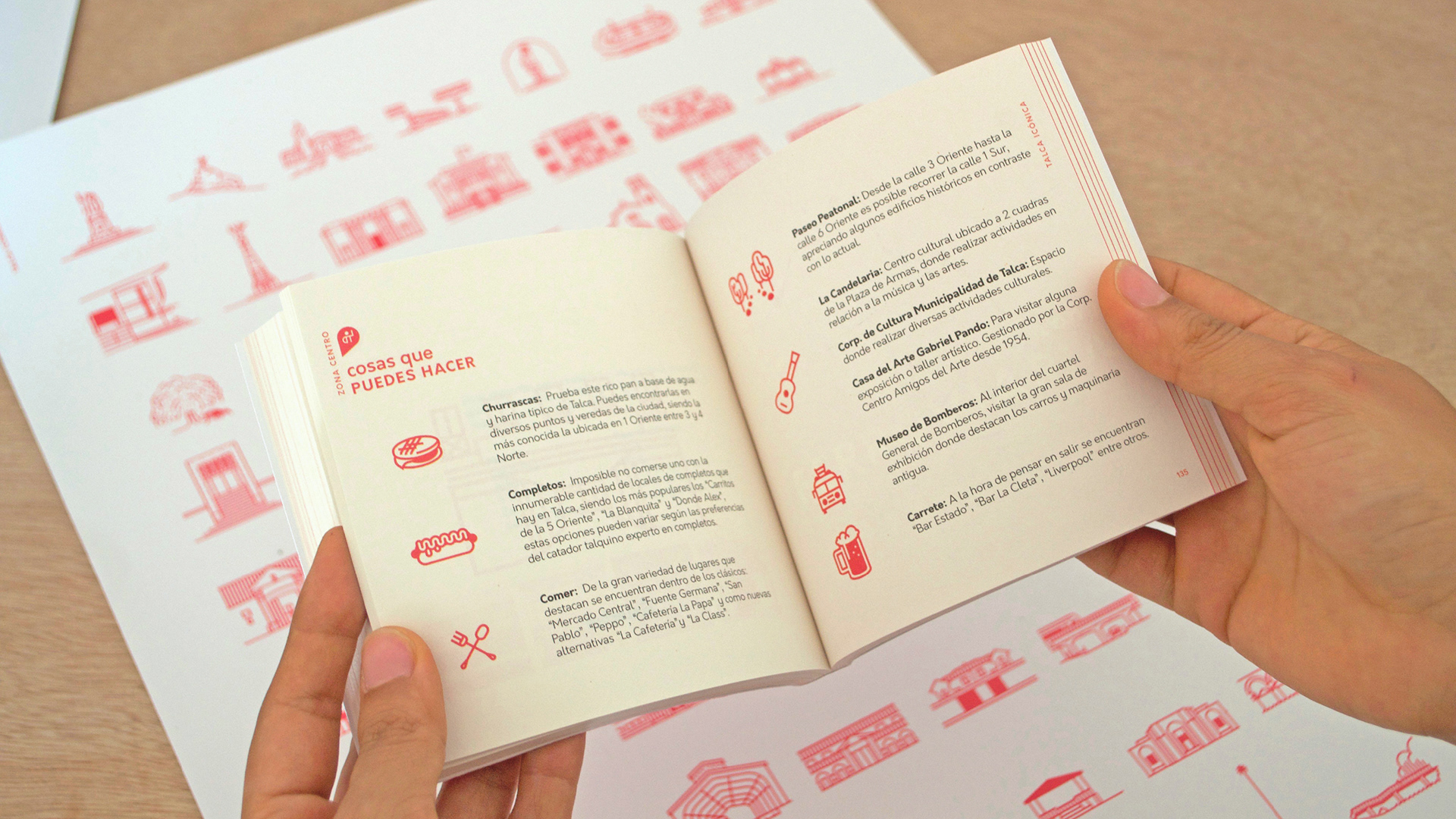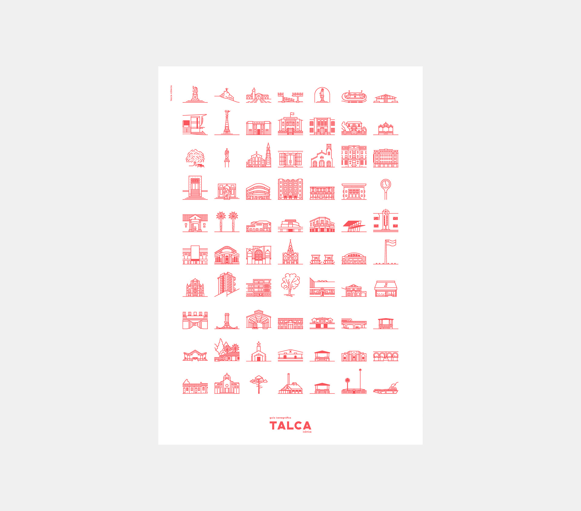 Talca Icónica, es un proyecto Fondart que busca documentar la ciudad de Talca del año 2019 en un libro de bolsillo que funciona como una guía iconográfica que facilita el recorrido y permite visitar lugares de la ciudad. Se desarrollo el sistema iconográfico que se componía de lugares y activiades aemás del diseño editorial del libro.